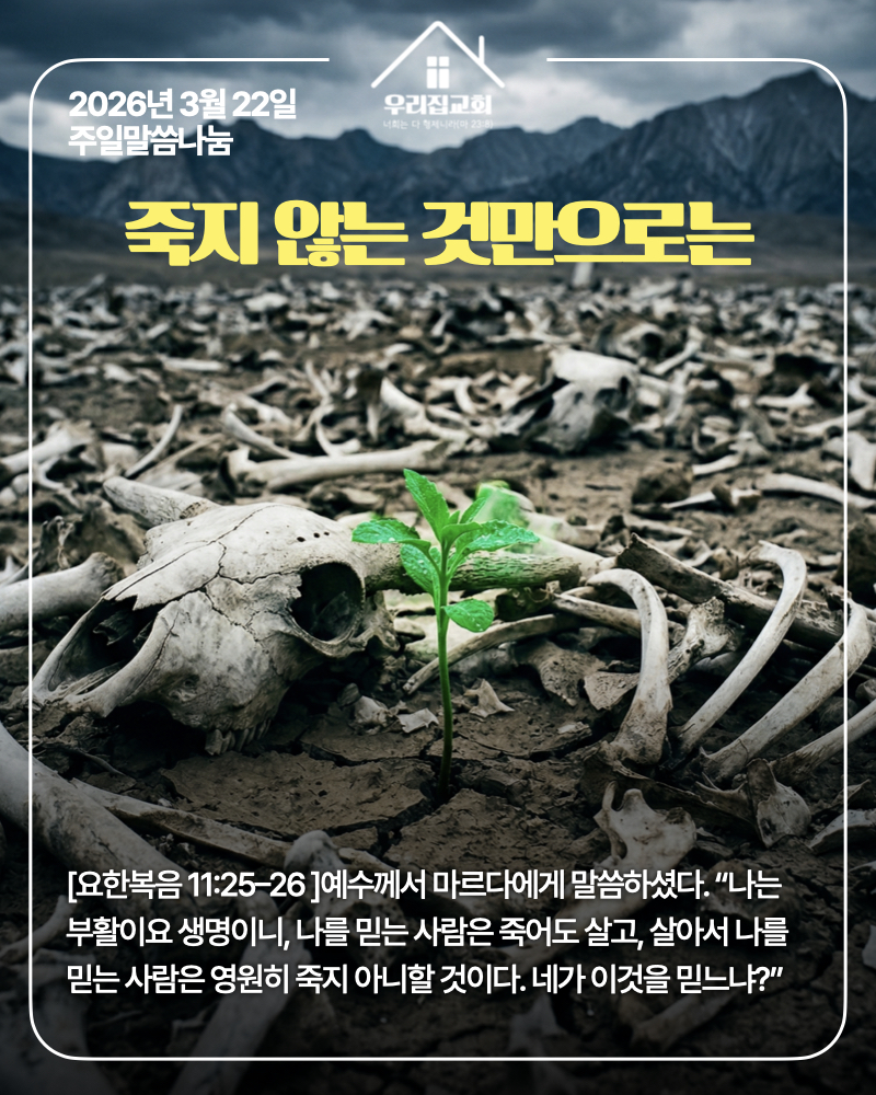 함께 읽은 말씀에스겔 37:1-14 / 요한복음 11:17-27 / 로마서 8:6-11 우리집교회의 예배는 한 사람의 설교가 아니라 함께 말씀을 읽고 나누는 이야기들로 구성됩니다. 우리는 서로가 서로에게 하나님의 도구가 되어 말씀을 전합니다 이번 주 함께 읽은 요한복음의 말씀은 우리가 잘 알고 있는 나사로가 살아나는 이야기 가운데 일부입니다. 예수님은 나사로가 병에 걸렸다는 소식을 듣고도 일부러 몇일을 지체해서 오십니다. 죽는 시점에 맞춰오신 것도 아니고 죽은지 나흘이 지나서 썩어 냄새가 나는 시점에 일부러 오십니다. 예수님을 만난 나사로의 누이들은 하나같이 같은 말을 합니다. '주님이 여기 계셨더라면, 내 오라버니가 죽지 아니하였을 것입니다.'(요11:21,32) 그들의 말이 맞습니다. 예수님이 계셨다..