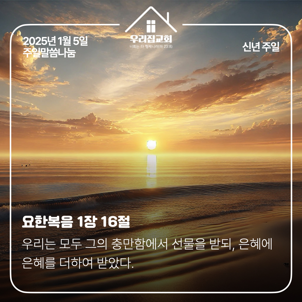 새로운 한 해가 밝았습니다. 매년 반복되는 새해 인사이지만 우리는 그 안에서 우리가 받은 복과 우리가 받고 있는 복, 그리고 우리가 받을 복이 무엇인지 기억해야 하겠습니다. 그것은 바로 우리에게 주어진 영원한 생명입니다.