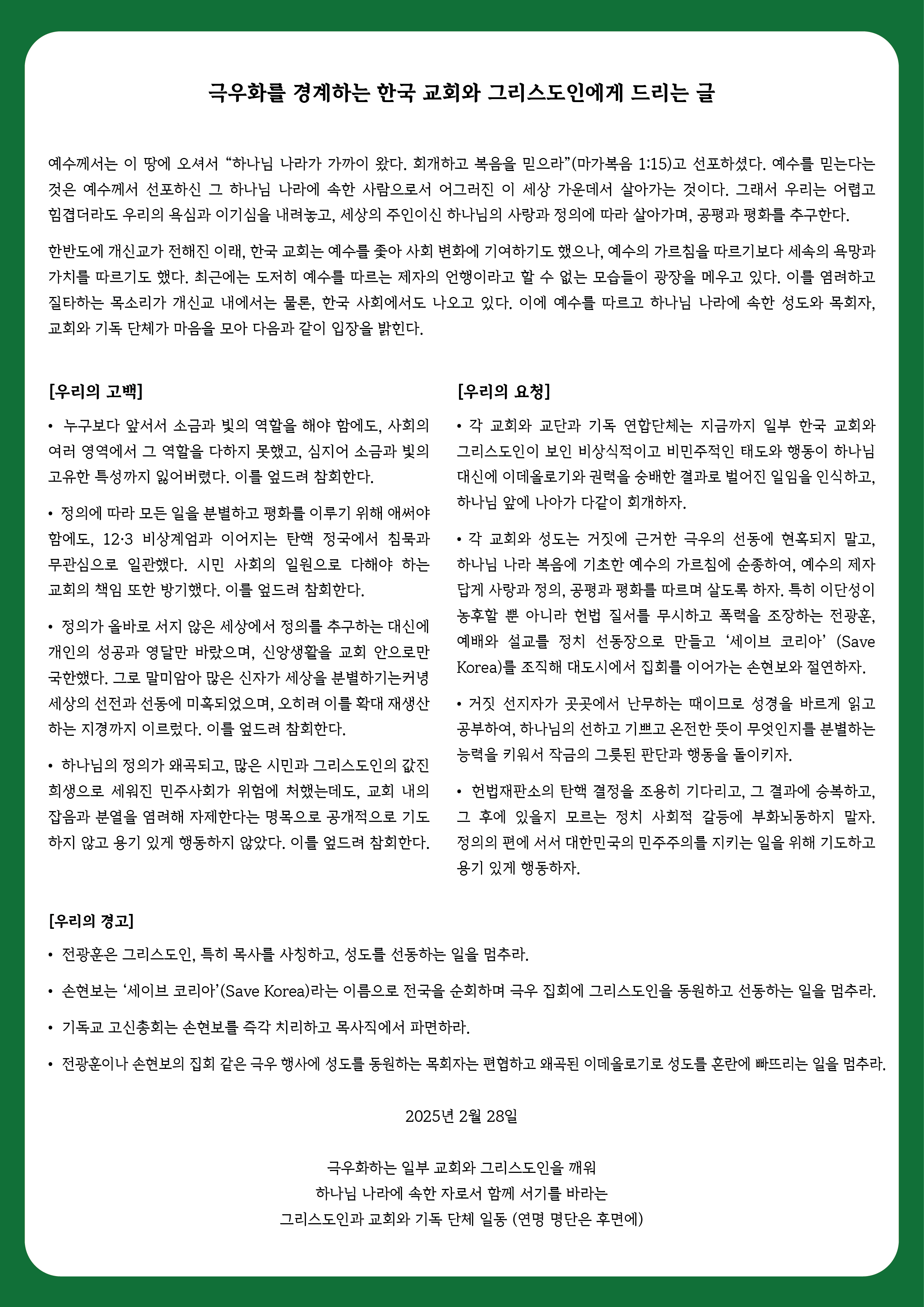 그럼에도 이런 비정상적인 상황에서 기독교의 이름으로 특정 정치적 견해가 대표되는 것은 문제가 있다고 판단했습니다. 21세기에 아직도 현실이라고 믿을 수 없는 지금의 사태를 바라보면서 우리가 할 수 있는 작은 일에 동참하고자 합니다.