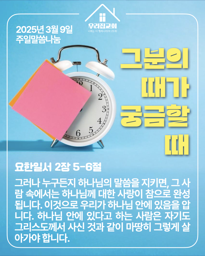 우리는 하나님의 때가 아니라 ‘하나님’을 알아야 합니다. 그분을 알고 우리도 그분 안에 있음을 알아야 합니다. 모세는 상황이 더 나빠지는 것을 보면서도 결국 그 길을 포기하지 않았습니다. 하나님의 때임을 알 수 없었으나 자신을 보내신 분이 하나님이시고 그분이 어떤 분이신지 알았기 때문입니다. 예수님은 자신의 때가 아님을 알면서도 물로 포도주를 만드셨습니다. 곤란에 빠진 부부를 향한 하나님의 마음을 이해하신 것입니다. 그렇기에 자신의 때가 아님을 알면서도 그 일을 하신 것입니다.