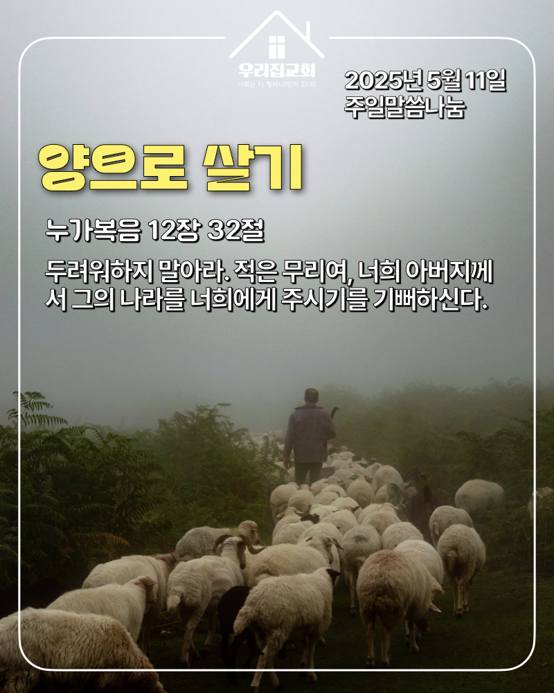 우리는 오늘도 거대한 세상 속에 먼지같은 존재처럼 살아갑니다. ‘내가 누구인지’ 깊이 생각하는 것이 사치처럼 보입니다. 하지만 하나님은 그런 우리가 사라지지 않고 여전히 남아있게 하십니다. 그리고 그 양떼에게 ‘염려하지 말아라’라고 말씀하십니다. 왜냐하면 당신이 자신의 양떼를 돌보실 것이기 때문입니다. 이를 위해서 그분은 스스로 그 양이 되시고 자신이라는 값으로 우리를 사셨습니다. 우리는 여전히 세상 속에 있지만 이미 값이 지불된, 하나님의 양떼입니다. 그분이 우리의 필요를 알고, 먹을 것과 마실 것을 채우시는, 돌봄받는 양떼인 것입니다. 그렇기에 ‘염려하지 말라’는 그분의 말씀은 명령이 아니라 위로와 사랑의 말씀이 됩니다.