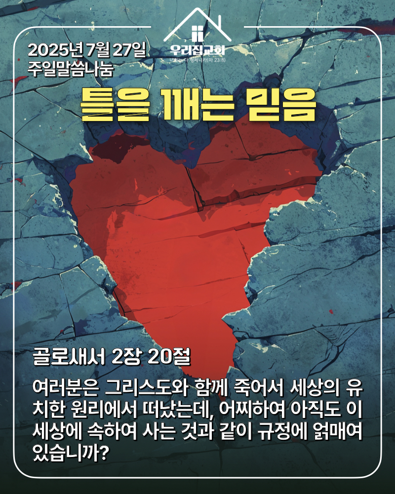 물론 자신을 지탱해주는 틀을 깬다는 것은 쉽지 않습니다. 그래서 때로 그것은 두렵습니다. 하지만 그럴수록 우리는 내가 알고 있는 지식이나 전통이 아니라 하나님을 의지할 수 있어야 합니다. 그리스도라는 머리에 붙어 있는 자는 내가 자라고 싶은 대로 자라지 않습니다. 하나님께서 자라게 하시는 대로 자라납니다.(19절) 우리를 붙들고 계시는 하나님을 의지하십시오. 그러면 틀을 깨뜨리는 믿음이 주님을 닮아가는 상상력과 기쁨으로 변화될 것입니다.