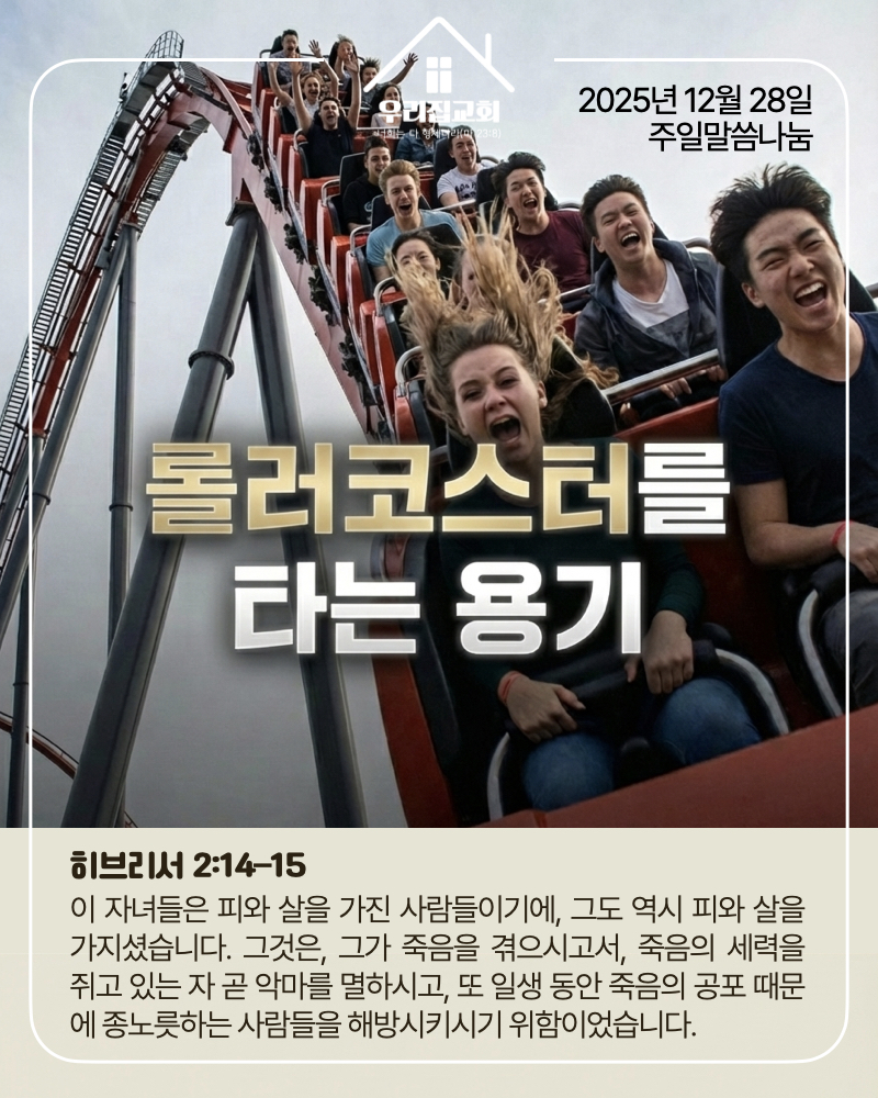 죽음의 공포를 넘어서 산다는 것은 어떤 것일까요? 우리의 삶은 끊임없이 죽음의 공포로 우리를 위협합니다. 매 순간 그것이 실재하는 것처럼, 그것이 해결되어야만 다른 것들이 의미있어지는 것처럼. 하지만 주님께서는 그런 우리에게 다가오셨습니다. 그리고 앞서 살펴 봤던 롤러코스터의 설계자처럼 우리 옆에 앉아서 두려움에 덜덜 떨고 있는 우리에게 이렇게 말씀하십니다. "야, 이거 내가 만들었어. 너 내가 타는 거 봤잖아.너 안 죽어." 죽음의 공포를 넘어서 살아간다는 것은 참된 생명이 어디에 있는지를 아는 것입니다. 그렇기에 그리스도의 십자가는 죽음 너머 부활을 바라보게 합니다. 오늘을 두려워하지 않고 내일을 살게 합니다. 우리의 2026년이 그렇게 생명 가득한 한해가 되어지길 기도합니다.