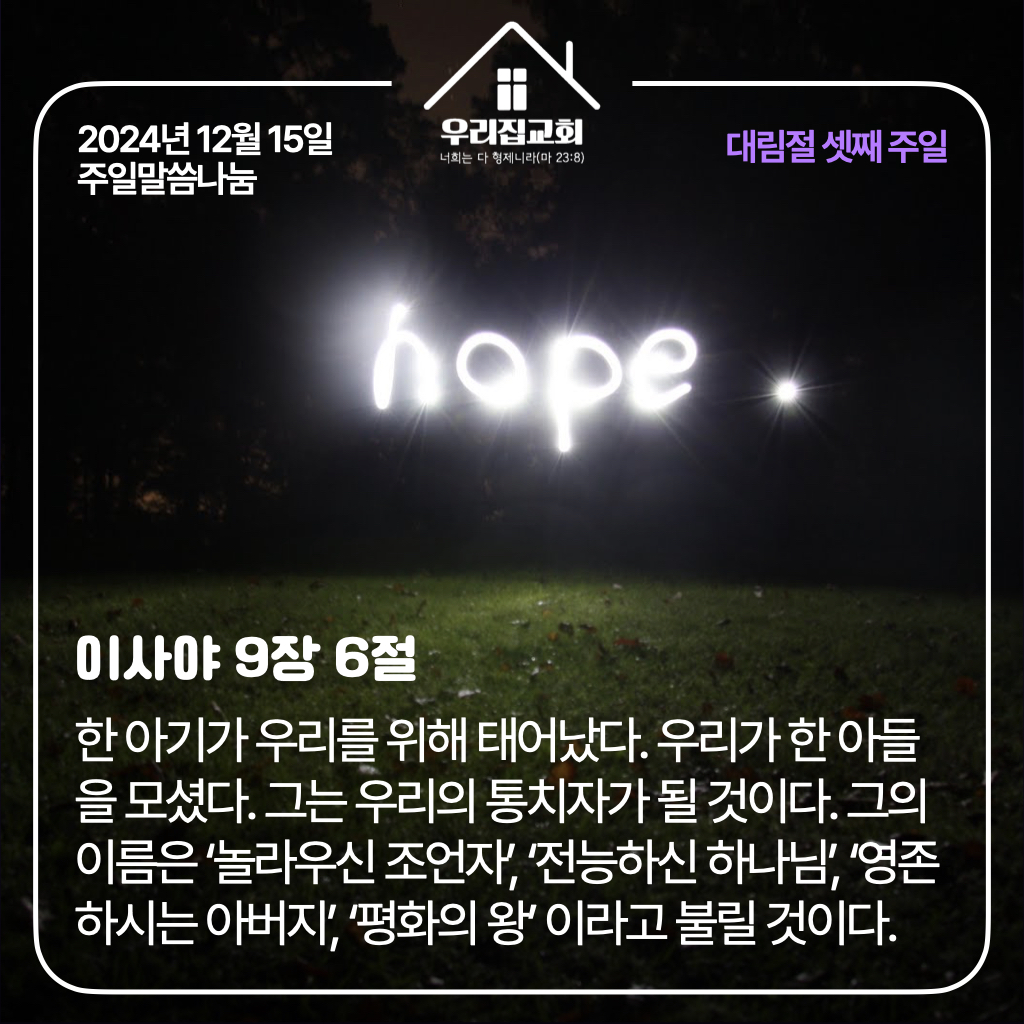 대림절은 한 아기의 탄생을 기억하는 날입니다. 그런데 한 아기의 나심이 어떻게 희망으로까지 연결될 수 있을까요? 사실 이 메시지는 굉장히 허황된 말처럼 들릴 수 있습니다. 왜냐하면 그 아기가 자라서 실제 왕이 되고 구원자가 될 때까지는 너무 긴 시간이 걸리기 때문이지요. 여기서 우리는 이 예언의 시점을 생각해봐야 합니다. 원문에서 아기의 태어남을 과거형으로 표현됩니다. 그리고 이어지는 아기에 대한 묘사는 모두 현재형입니다. 다시 말해 이 예언은 지금 다가온 구원사건 앞에서 감춰져 있던 그 시작점을 돌아보는 맥락인 것입니다.