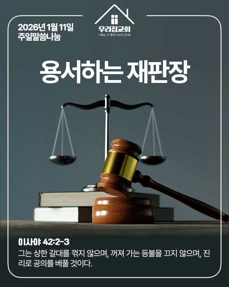 우리는 세상을 살아가며 어렵지 않게 '정의'에 대해서 말합니다. 하지만 그 정의가 때론 어떤 이에게 가혹하게 여겨지는 경우들이 있습니다. "참된 정의는 무엇인가?" 이것은 인류의 풀리지 않는 고민일지도 모르겠습니다. 정말 죄인을 처벌하는 것만이 '정의'의 본질일까요? 성경에는 인간을 실수에서 건져주는 도피성 같은 제도들이 있고, 망가진 인생을 다시 시작할 수 있게 해주는 희년도 있습니다. 떠나갔던 탕자는 돌아와 아버지 품에 안겼고, 교회를 핍박했던 바울은 가장 위대한 사도가 되었습니다. 이 말은 범죄를 방관한다는 의미가 아닙니다. 하나님의 공의가 처벌에서 끝나지 않는다는 것입니다. 유대인에게 이방인은 자신들을 침략한 원수였겠으나 하나님의 공의는 그들도 당신의 자녀로 품어 안으셨습니다. 하나님의 공의는 '죄인을 의인되게 하는 공의' 입니다.