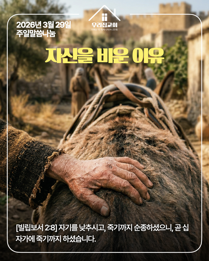 예수님이 보여주신 낮아지심, 자기 비우심은 훌륭한 성품이나 예수라는 분의 고고한 인격을 말하려는 것이 아닙니다. 그것은 하나님의 본성, 우리를 위해서 언제나 불안한 상태가 되기를 마다하지 않으시는 사랑, 하나님이심에도 모욕 당하고 고난 당하고 십자가에 달리기를 피하지 않으시는, 하나님 그분의 성품을 드러내시는 행동이었던 것입니다. 우리는 자칫 자기 비움이 마음을 공(空)으로 만드는 일종의 정신수양이나 성격 교정처럼 생각하는 경우가 있습니다. 하지만 그리스도의 자기 비움은 그가 빛나시기 위함이 아닙니다. 우리를 위해 언제나 자기를 비우고 계시는 하나님 아버지를 우리에게 보여주시는 행동인 것입니다. 그러므로 우리가 닮아야 하는 것은 그 사랑을 보여주기 위해, 우리가 아닌 하나님만 드러나시는 삶을 살아내는 것입니다. 그렇게 그분만 드러나시길 바라며 그분을 등에 업었던 행복한 나귀처럼, 나를 비워내고 하나님을 드러내는 우리의 한 주간이 되길 바랍니다.